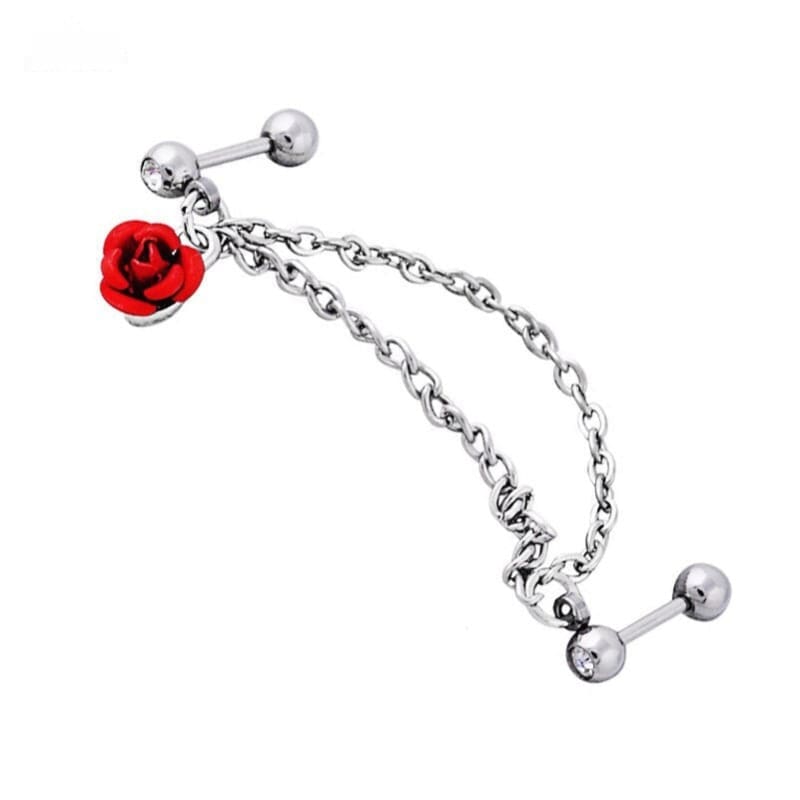 Nouveau piercing chaine pour les oreilles avec une rose rouge comme pendentifs pour amener une touche glamour.