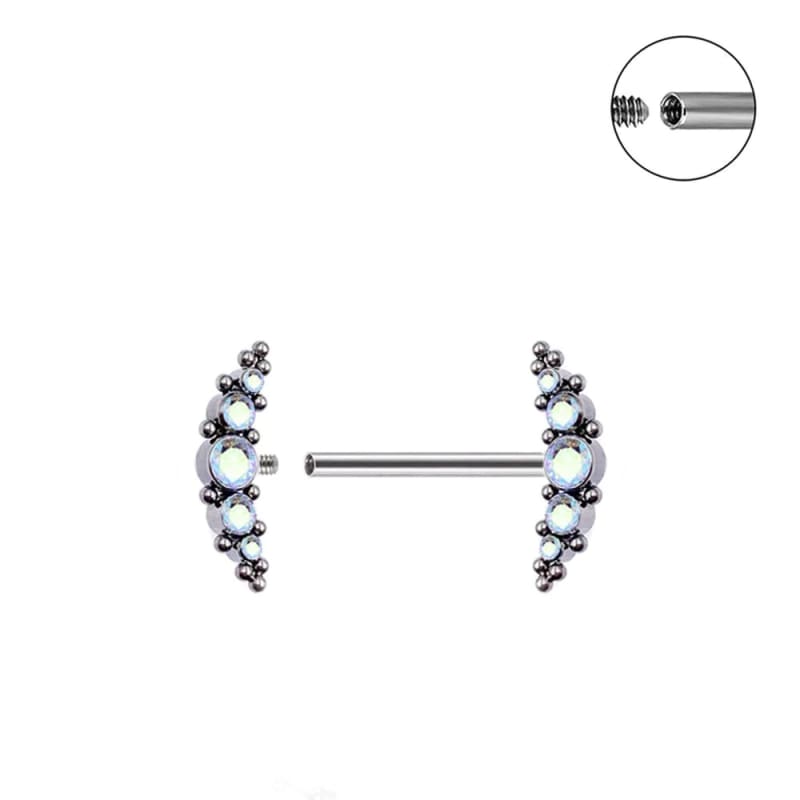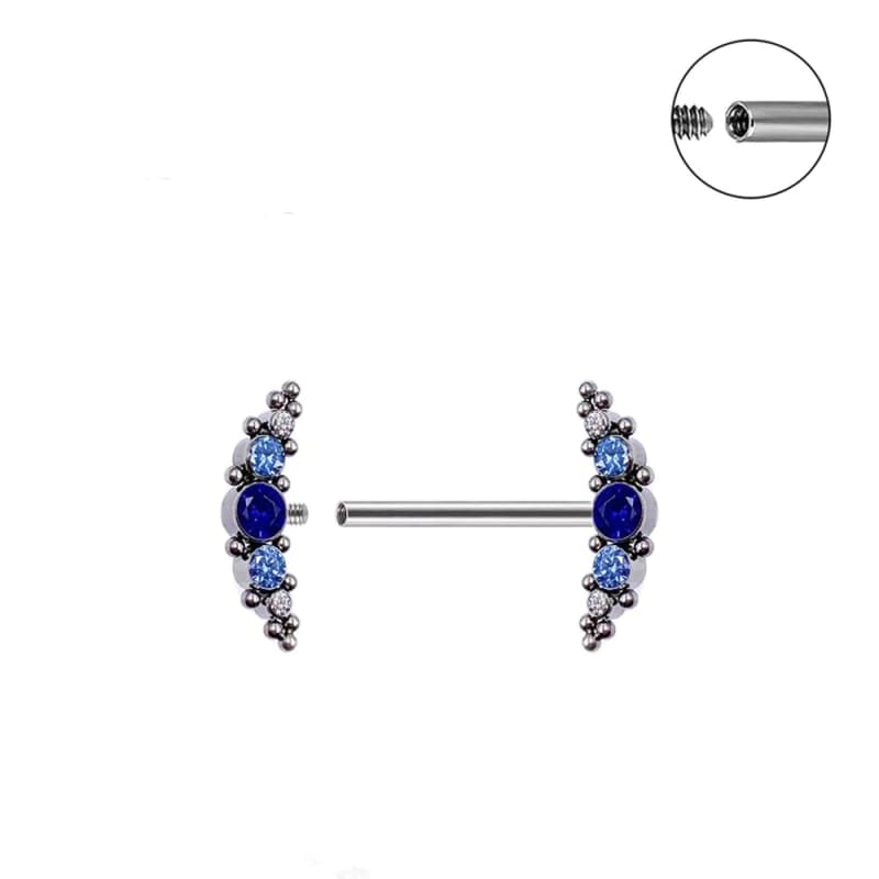 Magnifique piercing mamelon serti de belles pierres en zircon de couleur bleue, turquoise et Crystal.